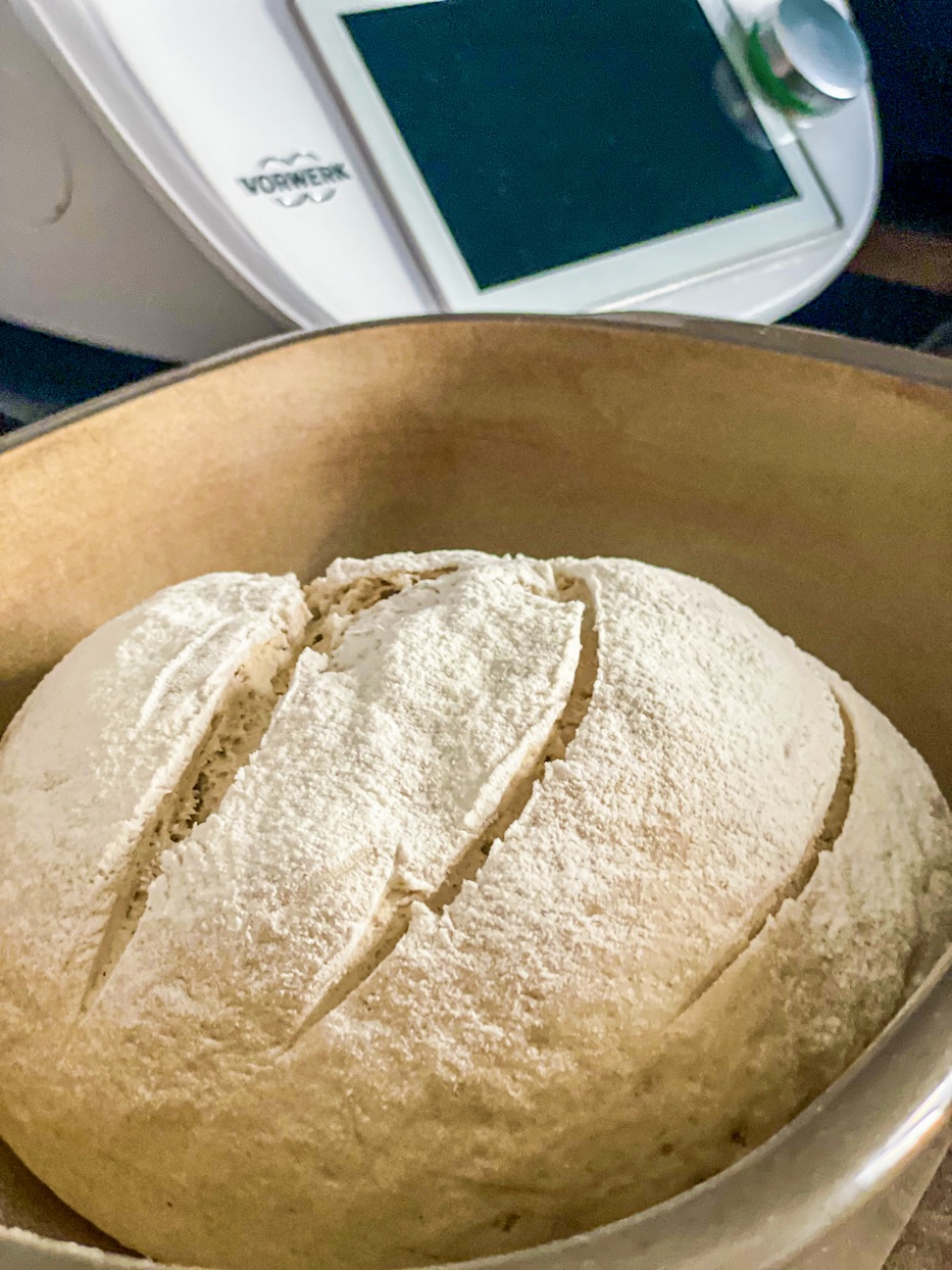 Nun legst Du das Brot in den bereitgestellten Topf und legst es hinein. Sprühe die Oberfläche mit Wasser ein und bestäube das Brot mit Mehl. Dann schneidest Du es oben mit einem Brotmesser nach Belieben ein. Den Deckel auf den Topf setzen und das Brot für ca. 30-35 Minuten auf der zweiten Schiene von unten backen. Die letzten 5 Minuten, den Deckel abnehmen (Vorsichtig: Sehr heiß!) und das Brot fertig backen, bis die Kruste schön goldbraun und knusprig ist.